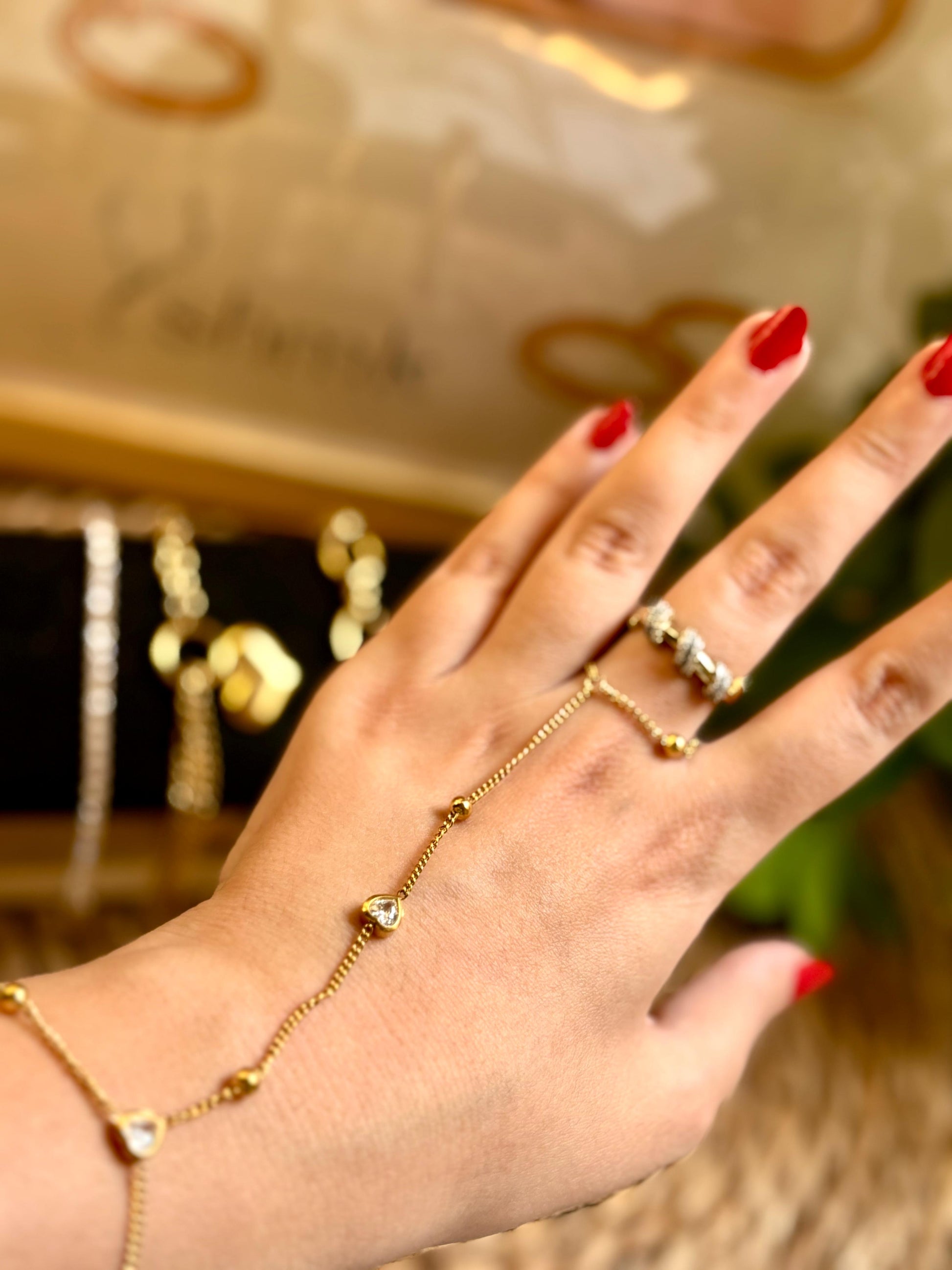 Add a chic statement to your look with this stainless steel hand chain bracelet in a radiant gold finish. Adorned with delicate heart-shaped zircon stones, it elegantly connects from wrist to finger, combining modern style with timeless charm. Made from durable, tarnish-free stainless steel, this piece is perfect for stacking or wearing solo for a unique and eye-catching accessory.